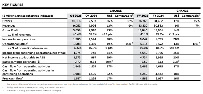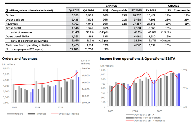 - The ABB Q4 2025 Full Year Results Presentation can be found here: https://library.e.abb.com/public/17c5f84dedb946478c22ba1e00f5673e/ABB-Q4-2025-press-release-English.pdf