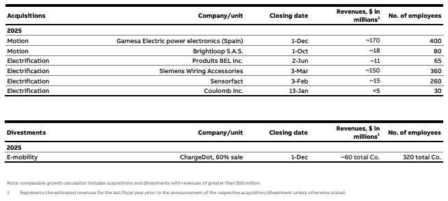 - On October 8, 2025, ABB announced it had signed an agreement to divest its Robotics division to SoftBank Group for an enterprise value of $5.375 billion, and therefore was not pursuing its earlier intention to spin-off the business as a separately listed company. The transaction is subject to regulatory approvals and further customary closing conditions and is expected to close in mid-to-late 2026.
