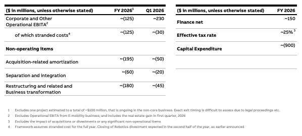 This press release includes forward-looking information and statements as well as other statements concerning the outlook for our business, including those in the sections of this release titled “CEO summary,” “Outlook,” “Sustainability” “Significant events” and “Additional 2026 guidance”. These statements are based on current expectations, estimates and projections about the factors that may affect our future performance, including global economic conditions and the economic conditions of the regions and industries that are major markets for ABB. These expectations, estimates and projections are generally identifiable by statements containing words such as “anticipates,” “expects,” “estimates,” “intends,” “plans,” “targets,” “guidance,” or similar expressions. However, there are many risks and uncertainties, many of which are beyond our control, that could cause our actual results to differ materially from the forward-looking information and statements made in this press release and which could affect our ability to achieve any or all of our stated targets. These include, among others, business risks associated with the volatile global economic environment and political conditions, market acceptance of new products and services, changes in governmental regulations and currency exchange rates. Although ABB Ltd believes that its expectations reflected in any such forward looking statement are based upon reasonable assumptions, it can give no assurance that those expectations will be achieved