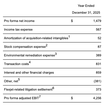 We define pro forma adjusted EBIT as pro forma net income excluding taxes, interest, amortization of acquisition-related intangibles, stock compensation expense, environmental remediation expense, pension income (expense), repositioning and other charges, transaction costs, other items within Other expense, net, and other items that are unusual or non-recurring in nature, including but not limited to impairment charges and litigation charges (e.g., comprehensive settlement related to Flexjet litigation). We believe this measure is useful to investors as it provides greater transparency with respect to supplemental information used by management in its financial and operational decision making, as well as understanding ongoing operating trends.