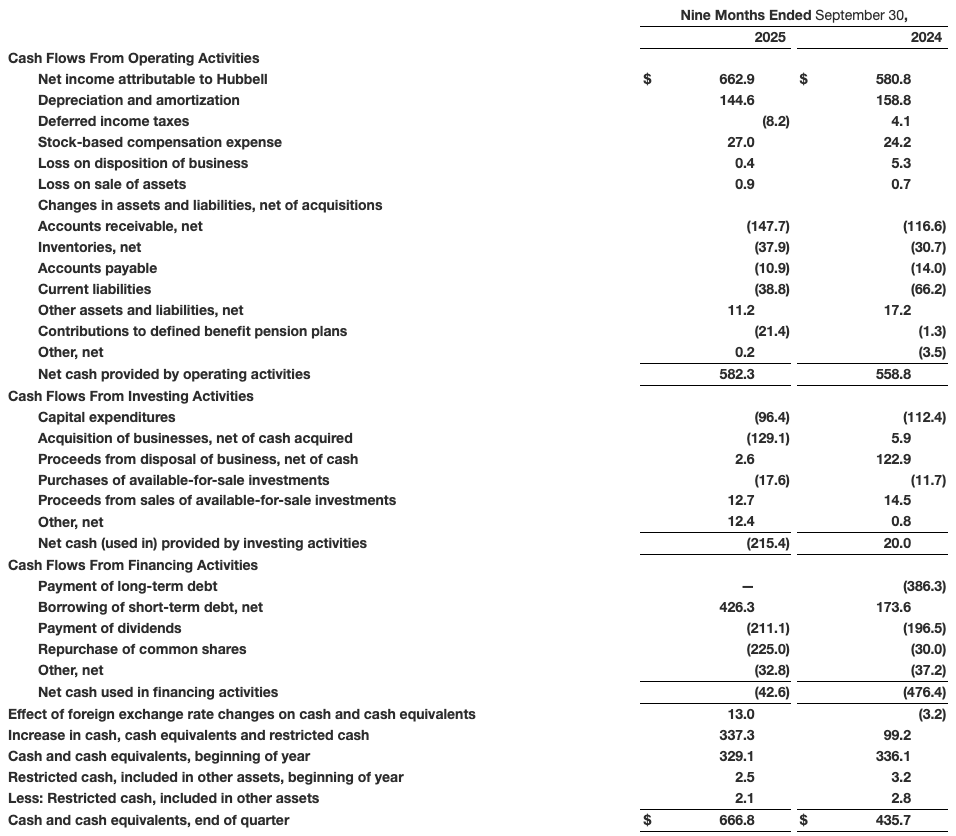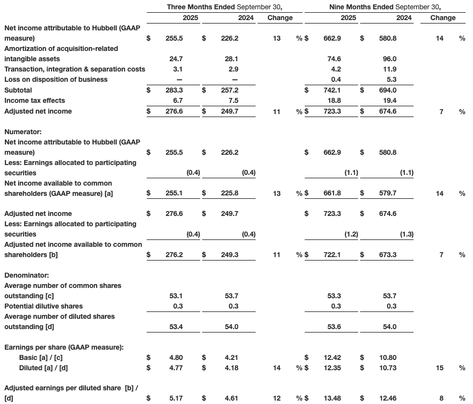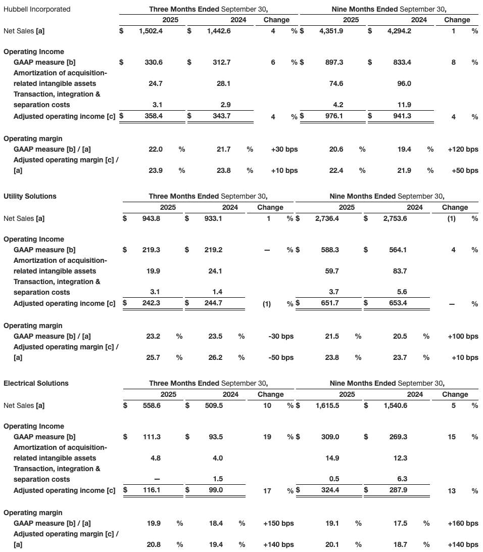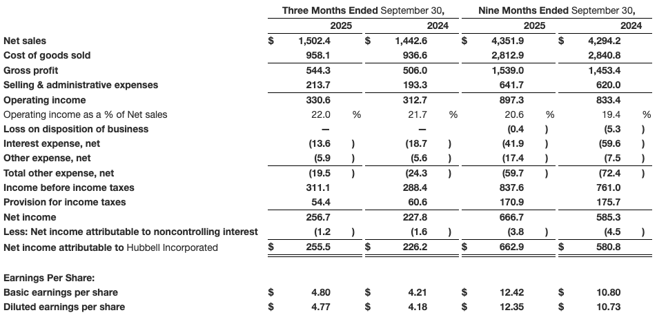 Hubbell Incorporated (NYSE: HUBB) today reported operating results for the third quarter ended September 30, 2025.