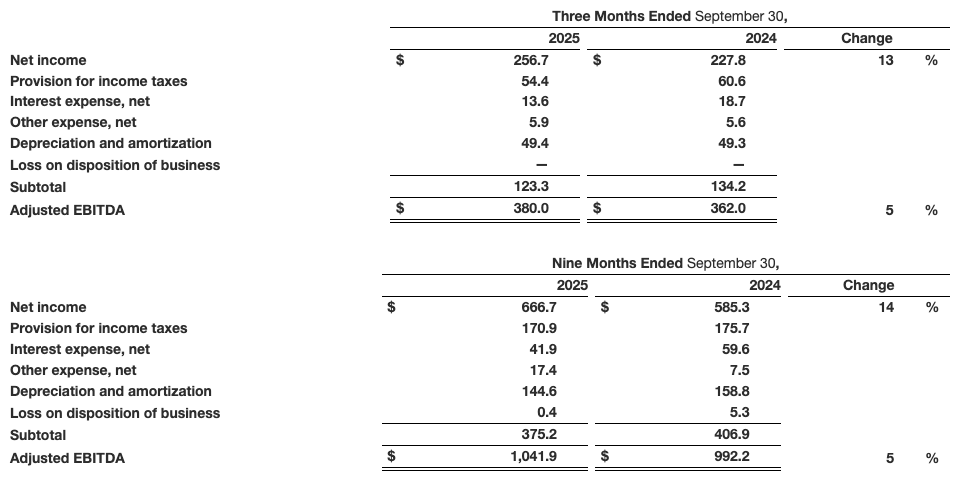 Adjusted diluted EPS in the third quarter 2025 excludes $0.35 of amortization of acquisition-related intangible assets and $0.05 of transaction, integration, and separation costs. Adjusted diluted EPS in the third quarter 2024 excluded $0.39 of amortization of acquisition-related intangible assets and $0.04 of transaction, integration, & separation costs.