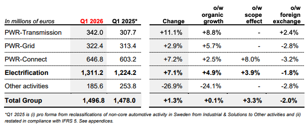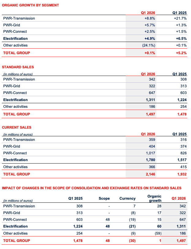 - Group Q1 2026 standard sales stood at €1.5 billion (current sales of €2.1 billion), with a robust and healthy level of organic growth at +4.9% in Electrification driven by PWRTransmission at +8.8%, PWR-Grid at +5.7% and PWR-Connect at +2.5%
