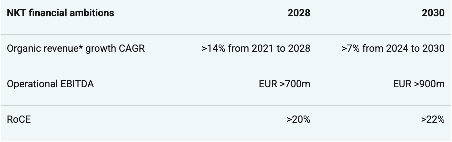 To accompany the Charging Forward strategy, NKT is launching financial ambitions for 2030. At the same time, the current 2028 ambitions updated in Company Announcement no. 35 of December 2024 are confirmed and unchanged.