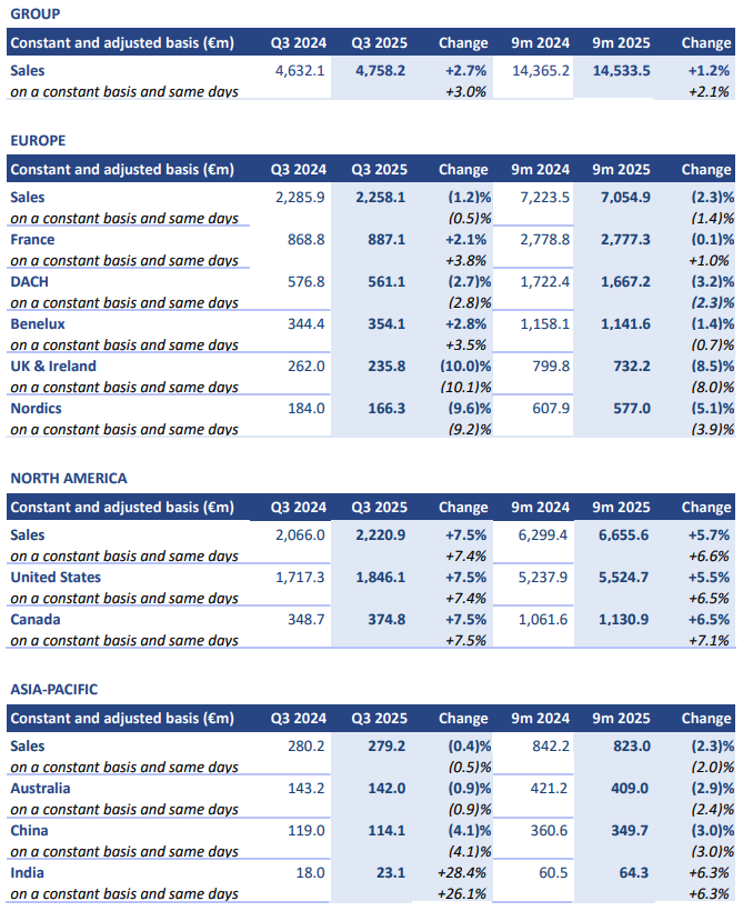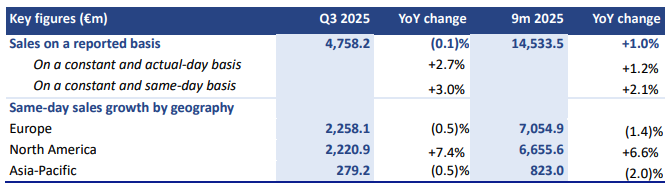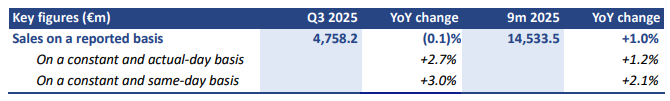 → Q3 25 sales of €4,758m, up +3.0% on a same-day basis