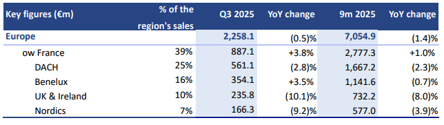 In Q3 25, sales in Europe stood at (1.2)% on a reported basis, including: