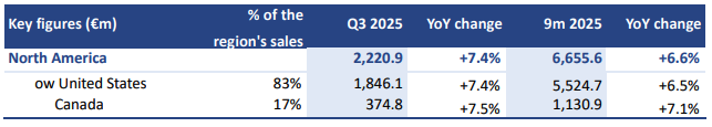 North America (47% of Group sales): Strong sales growth of +7.4% in Q3 and +6.6% in 9m on a constant and same-day basis