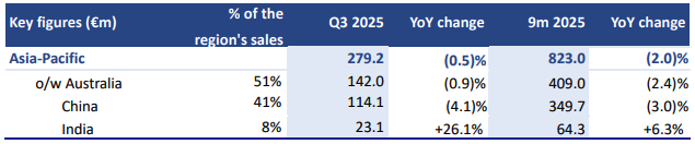 - The sales growth acceleration in Q3 25 (vs Q2 25) was supported by improving trends in Europe and APAC