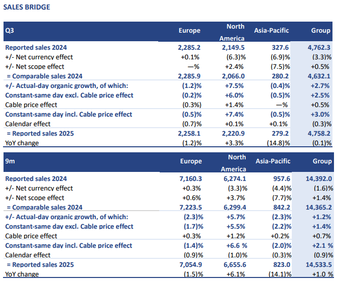 - Constant and same-day sales growth of +3.0%, with a volume growth acceleration (+1.6% contribution), and a similar pricing contribution compared to Q2 25 (+0.9% positive selling-price effect on non-cable products and +0.5% on cable products)