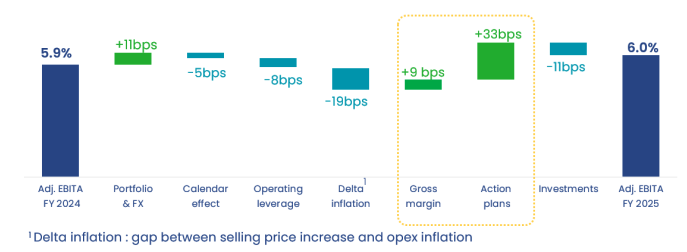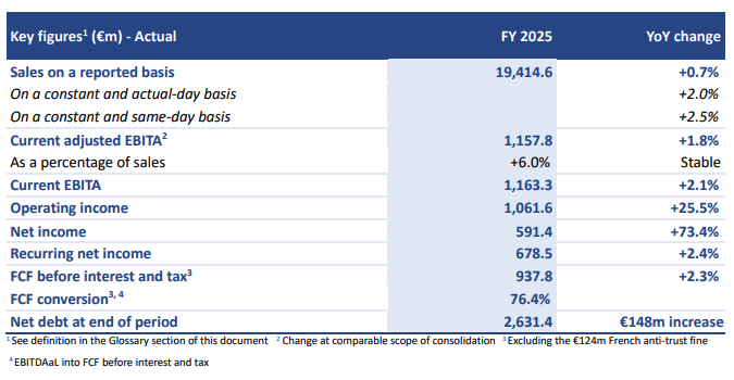In a low-growth environment marked by a +2.0% actual-day sales increase in FY 2025, profitability was resilient as reflected by the current adjusted EBITA margin of 6.0% up +10bps versus the 5.9% adjusted EBITA margin reported in 2024 (and stable on a comparable basis)