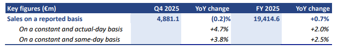 - Q4 sales of €4,881.1m, rose +3.8% on a same-day basis (up +4.7% on an actual-day basis), accelerating sequentially with positive momentum in all regions
