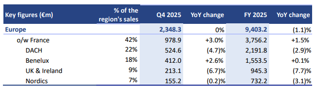 Europe (48% of Group sales): Stable sales evolution in Q4, down (1.1)% in FY 2025 on a constant and sameday basis