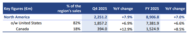North America (46% of Group sales): Strong sales growth of +7.9% in Q4 and +7.0% in FY 2025 on a constant and same-day basis