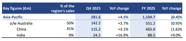 Asia-Pacific (6% of Group sales): Sales increased by +4.5% in Q4 and decreased by (0.4)% in FY 2025 on a constant and same-day basis