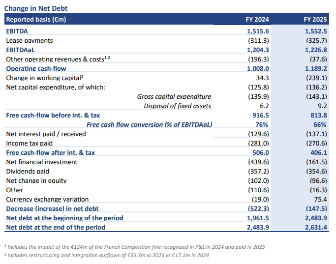 → Free cash flow conversion at 66.3%, or 76.4% excluding the impact of the €124m French Competition Authority fine paid in April, significantly outpacing our guidance for the third consecutive year and confirming our cash-generative model