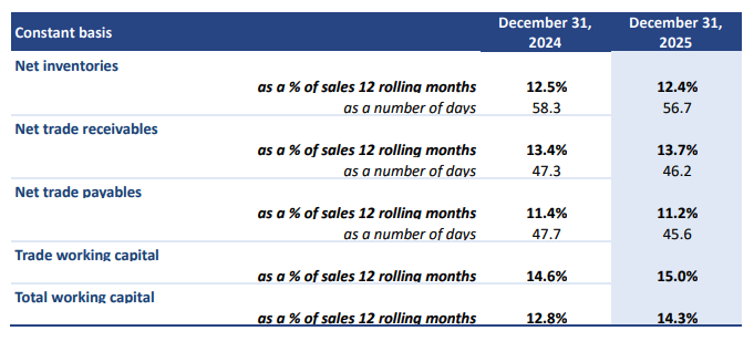 - The change in trade working capital was an outflow of €(138.7)m. On a constant basis, trade Working Capital Requirements (TWCR) stood at 15.0% of sales in 2025, (vs 14.6% in 2024), mainly related to the sales growth acceleration in Q4. In number of days, both Inventories & Receivables improved, partly offsetting deterioration in payables. DOI & DSO improved by respectively 1.5 and 1 day