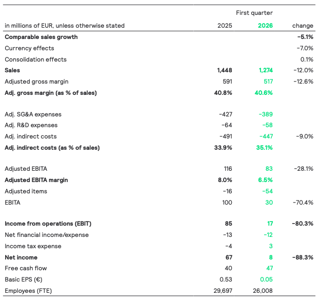 Nominal sales decreased by 12% to EUR 1,274 million, including a negative currency effect of 7.0% primarily related to USD depreciation. Comparable sales declined by 5.1%, reflecting a softer performance in the Professional and Consumer businesses, while the OEM business showed early signs of stabilization.
