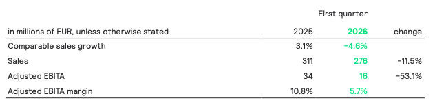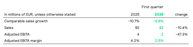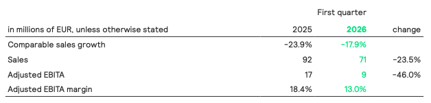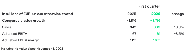 Nominal sales decreased by 10.4% to EUR 82 million, including a negative currency effect of 5.6% mostly related to the depreciation of the US dollar. Comparable sales declined 4.8%, reflecting continued market softness, with pricing pressure beginning to ease and performance showing clear signs of stabilization. The Adjusted EBITA margin decreased to 2.5%, as gross margin was impacted by lower volumes. This was partly offset by cost actions.