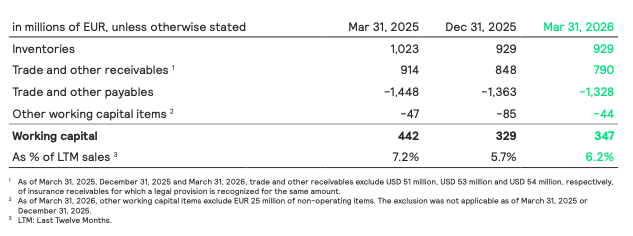 Working capital increased from EUR 329 million at the end of December 2025 to EUR 347 million at the end of March 2026. The increase is driven by a reduction in payables, partly offset by lower receivables. As a percentage of last twelve-months sales, working capital increased by 50 bps to 6.2%.