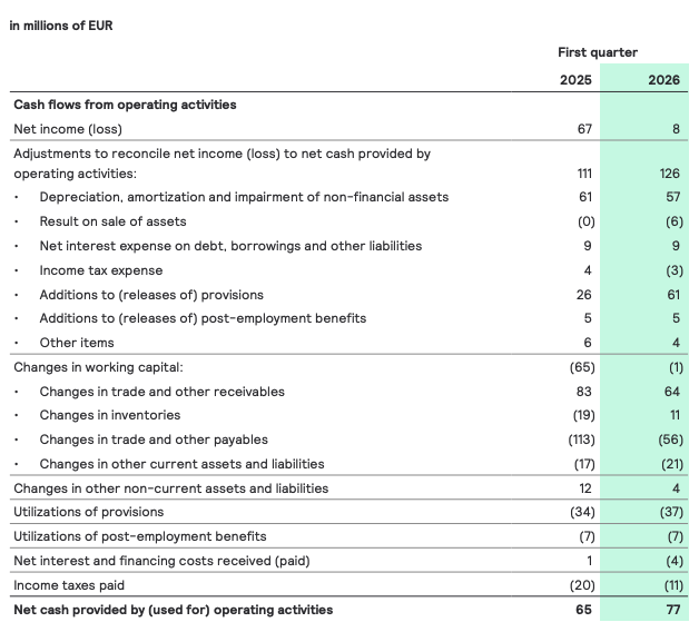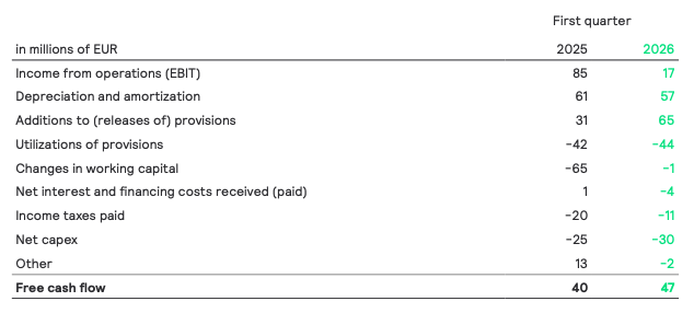 Free cash flow increased to EUR 47 million, primarily due to improved working capital management, partly offset by a lower income from operations. Free cash flow included a restructuring payout of EUR 22 million (Q1 25: EUR 13 million).