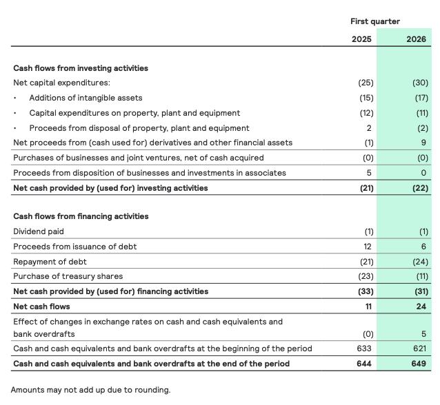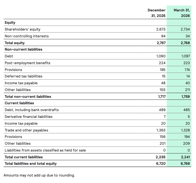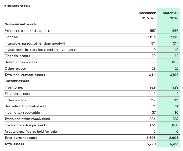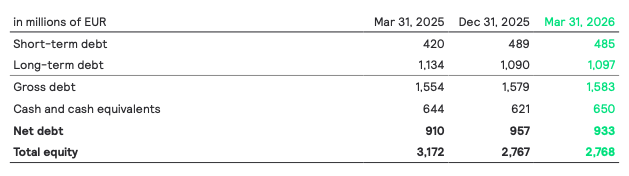 Compared with the end of December 2025, the cash position increased by EUR 29 million to EUR 650 million, while gross debt remained broadly stable at EUR 1,583 million. Net debt decreased by EUR 24 million to EUR 933 million. Total equity remained largely unchanged increasing to EUR 2,768 million (Q4 25: EUR 2,767 million).