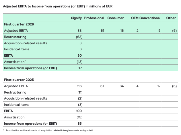 ‘Other’ reflects the P&L of Signify’s venture businesses, in addition to centrally incurred costs not assigned to individual businesses, predominantly those related to exploratory research initiatives and audit activities. Adjusted EBITA was EUR -5 million (Q1 2025: EUR -6 million).