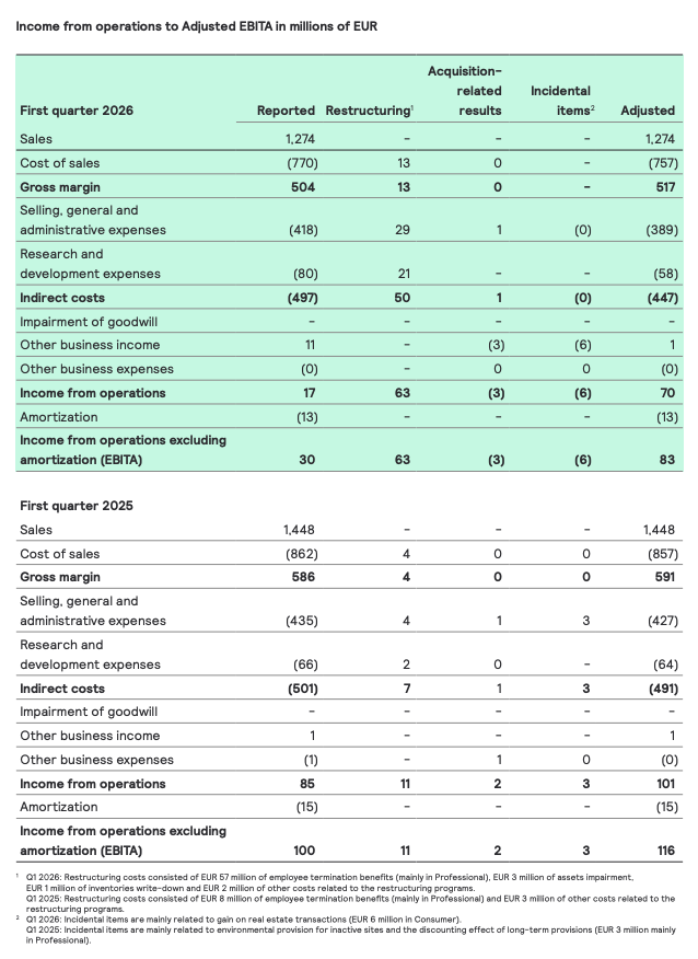 Restructuring costs were EUR 63 million, acquisition-related results were EUR 3 million, and incidental items were EUR 6 million. The restructuring costs booked in Q1 mainly relate to the EUR 180 million cost reduction program announced in January 2026.