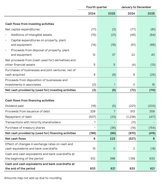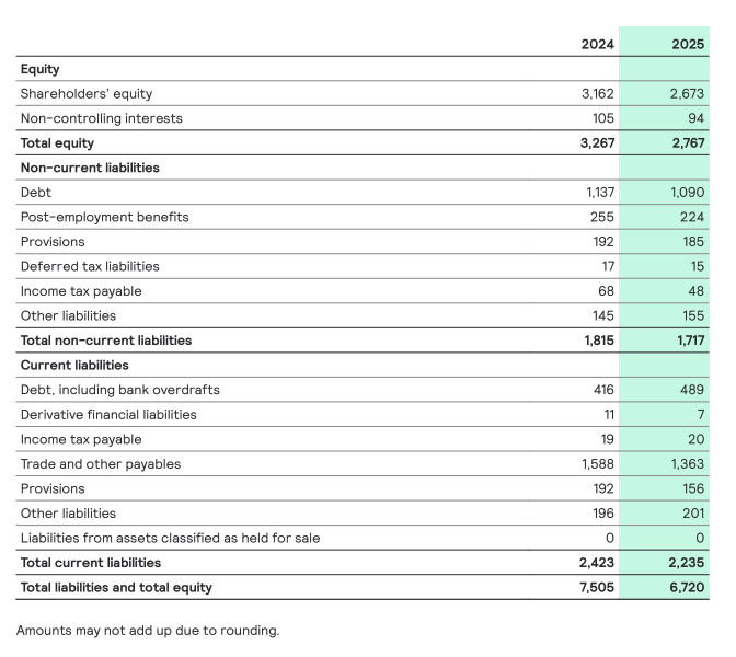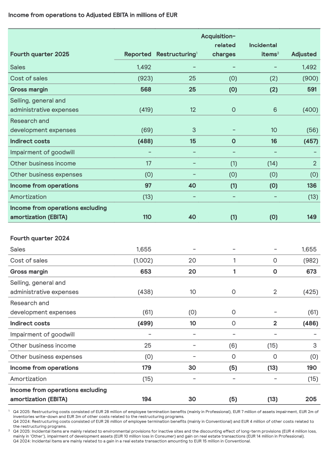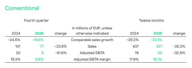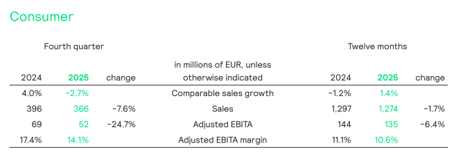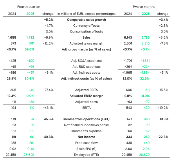 - FY 25 sales of EUR 5,765 million with a CSG of -3.4%; Q4 25 sales of EUR 1,492 million with a CSG of -5.2%