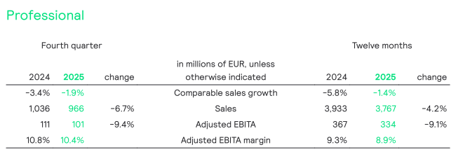 Nominal sales decreased by 4.2% to EUR 3,767 million, including a negative currency effect of 2.8% largely due to USD depreciation. Comparable sales decreased by 1.4%, as growth in the US Professional business was offset by the weakness in Europe’s Professional business, particularly in the trade channel, and in emerging markets. The Adjusted EBITA margin decreased by 40 bps to 8.9% mainly reflecting price and volume pressure in European business, while the effect of trade tariffs was mitigated.