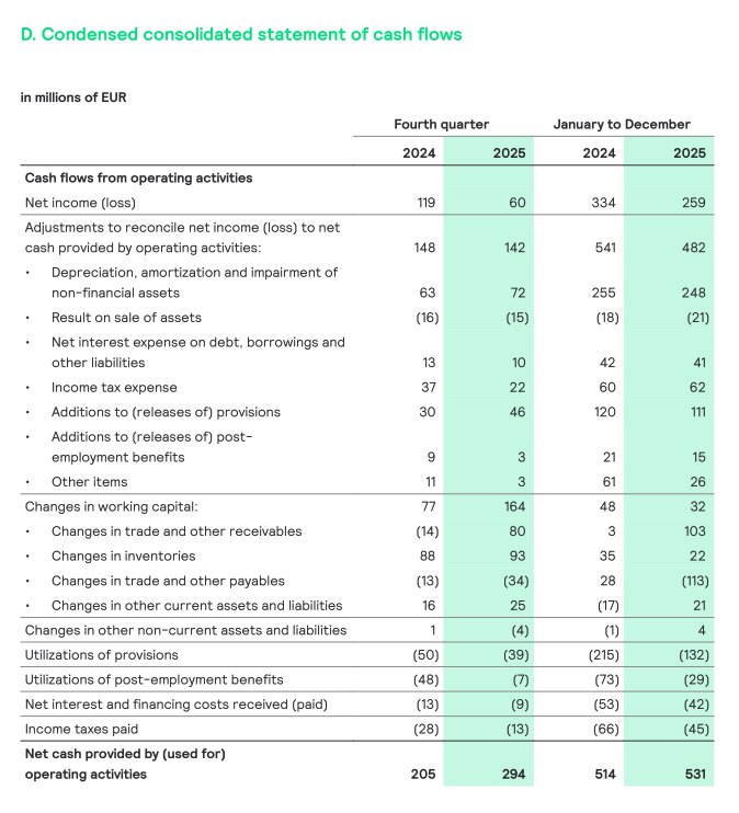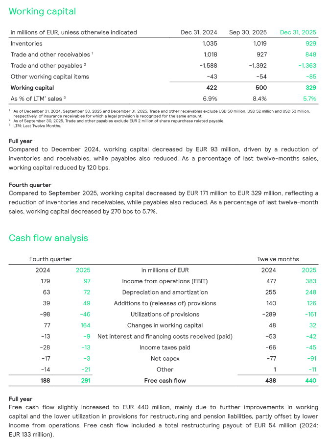 - Free cash flow of EUR 440 million (FY 24: EUR 438 million) and of EUR 291 million in Q4 25 (Q4 24: 188 million) driven by disciplined working capital management
