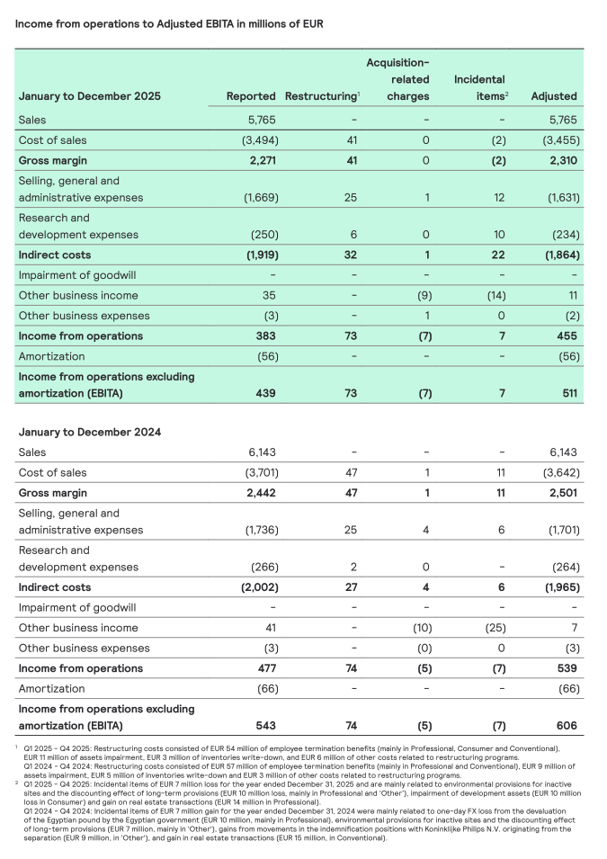 Nominal sales decreased by 9.9% to EUR 1,492 million, including a negative currency effect of 4.7% mainly related to USD depreciation. Comparable sales declined by 5.2%, reflecting weakness in OEM and Professional Europe businesses and the China Consumer business, while the US Professional business continued to grow. Excluding the Conventional business, Signify’s Q425 comparable sales declined by -4.2%.
