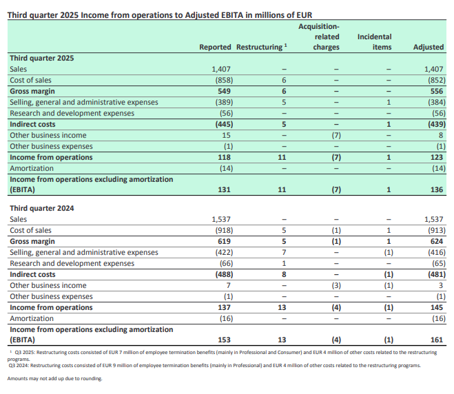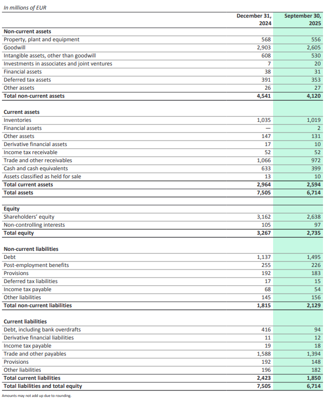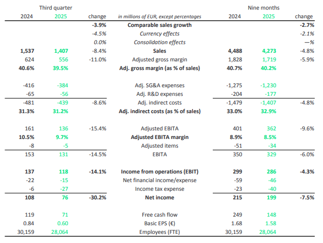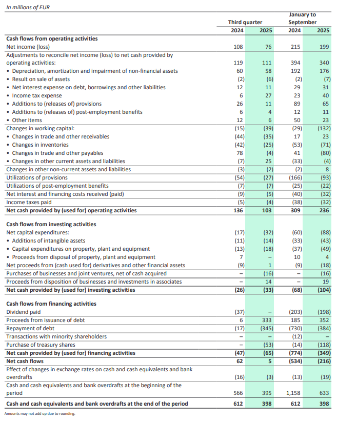 Free cash flow decreased to EUR 71 million, mainly due to lower income from operations and a higher cash outflow from working capital and capex, partly offset by a lower payout related to restructuring. In Q3 25, free cash flow included a restructuring payout of EUR 11 million (Q3 24: EUR 32 million).