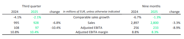 Nominal sales decreased by 6.8% to EUR 928 million, including a negative currency effect of 4.6% mainly related to the depreciation of the US dollar. Comparable sales growth was -2.1% (Q3 24: -4.1%), reflecting the continued softness in Europe and a stronger than expected slowdown in the US, particularly in the trade channel, which were partly offset by a strong agricultural lighting performance. The Adjusted EBITA margin decreased by 40 bps to 10.4%, mostly due to an under-absorption of fixed costs.