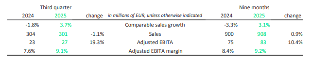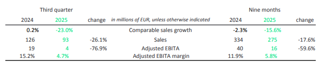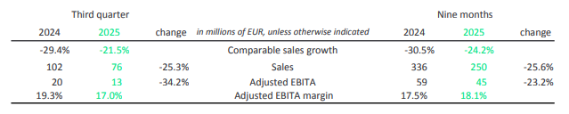 Nominal sales were EUR 9 million (Q3 2024: EUR 10 million) and adjusted EBITA was EUR -5 million (Q3 24: EUR -8 million).