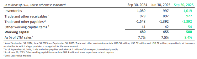 Compared to September 2024, working capital increased by EUR 20 million, as a reduction of inventories and receivables was more than offset by lower payables. As a percentage of last 12 months’ sales, working capital increased by 70 bps.