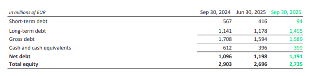 Compared to the end of June 2025, the cash position increased by EUR 3 million to EUR 399 million, mainly driven by free cash flow generation offset by the continuing share repurchase program. During the quarter, EUR 325 million short-term debt was repaid and replaced with new three-year long-term debt of EUR 325 million. Gross debt slightly decreased to EUR 1,589 million and net debt reduced to EUR 1,191 million. Total equity increased to EUR 2,735 million (Q2 25: EUR 2,696 million), primarily due to net income offset by share repurchases.